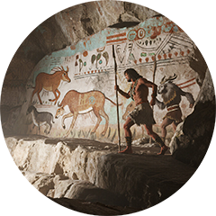 洞穴之中、岩石雕刻、红黄涂染、颜料绘制、色彩鲜艳